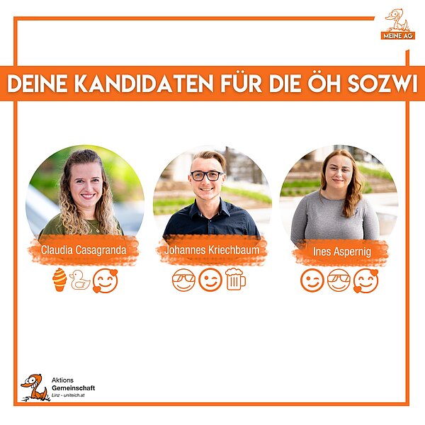 Für die Studienvertretung Sozialwirtschaft kandidieren unsere engagierten AGler mit einer super motivierten Spitzenkandidatin voran. Die Lieblingsemojis unserer Kandidaten findest du im Bild.